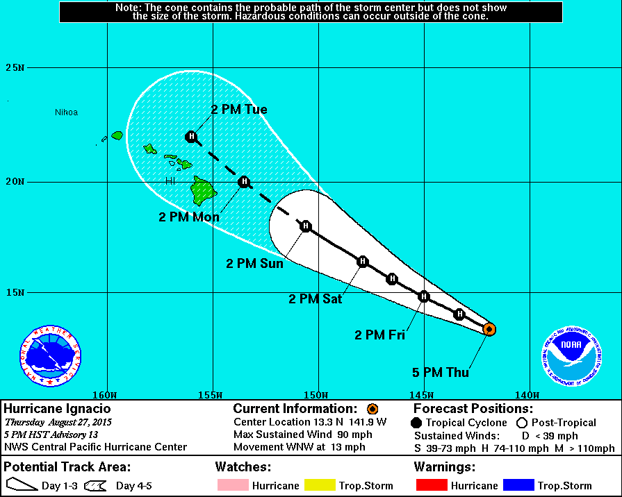 ALTHOUGH ITS OVERALL APPEARANCE HAS BECOME A BIT RAGGED IN THE SATELLITE IMAGERY ON THE WEST SIDE THIS AFTERNOON...DEEP CONVECTION NEAR THE CENTER OF IGNACIO CONTINUES TO PUSH TOPS ABOVE THE -80C LEVEL. THE EYE HAS REMAINED CLOUD-FILLED THROUGH THE DAY WITHIN A CENTRAL DENSE OVERCAST. A 2246 UTC GPM PASS SHOWED THE STRONGEST CORE CONVECTION SOUTHEAST OF THE CENTER. DVORAK INTENSITY ESTIMATES CAME IN AT 77 KT FROM SAB AND JTWC...AND 90 KT FROM PHFO. THE 2330 UTC CIMSS ADT ESTIMATE WAS ONCE AGAIN CLOSE TO 80 KT. WITH THE AVAILABLE ESTIMATES UNCHANGED...THE INITIAL INTENSITY FOR THIS ADVISORY PACKAGE IS ONCE AGAIN HELD AT 80 KT. A 1932 UTC ASCAT PASS WAS USED TO HELP REFINE THE WIND RADII. THE INITIAL MOTION FOR THIS ADVISORY IS 290/11 KT. IGNACIO IS MOVING SOUTH OF A SUBTROPICAL RIDGE WHICH IS EXPECTED TO WEAKEN. THIS WILL RESULT IN A SLOWER FORWARD MOTION STARTING TONIGHT. OBJECTIVE AIDS FOR THIS PACKAGE CONTINUE TO SHOW A GENERAL WEST-NORTHWEST TO NORTHWEST TRACK THROUGH THE FORECAST PERIOD. THE LATEST GFS HAS SHIFTED ITS FORECAST TRACK SOUTHWARD A BIT...POSSIBLY DUE TO A WEAKER PROJECTED CYCLONE IN THE MODEL. THE HWRF HAS SHIFTED SOUTH AS WELL WITH A WEAKER SYSTEM. THE CURRENT FORECAST MAINTAINS THE TRACK OF THE PREVIOUS FORECAST AND IS CLOSE TO THE GFEX THROUGH 72 HOURS...THEN CLOSE TO THE GFS AT 96 AND 120 HOURS. DESPITE BEING OVER SEA SURFACE TEMPERATURES ABOVE 28C AND LIGHT TO MODERATE VERTICAL WIND SHEAR...IGNACIO HAS NOT BEEN ABLE STRENGTHEN TODAY. ACCORDING TO SHIPS GUIDANCE...A WINDOW FOR FURTHER STRENGTHENING SHOULD EXIST THROUGH 48 HOURS. THE CURRENT FORECAST REFLECTS THIS...THOUGH WITH A MAXIMUM INTENSITY LOWERED TO 95 KT DUE TO TODAY/S TRENDS. GRADUAL WEAKENING IS FORECAST BEYOND 48 HOURS...MAINLY DUE TO SLIGHTLY COOLER SEA SURFACE TEMPERATURES AND INCREASING VERTICAL WIND SHEAR. THIS IS CLOSE TO THE IVCN CONSENSUS THROUGH 48 HOURS AND DSHP BEYOND 48 HOURS. FORECAST POSITIONS AND MAX WINDS INIT 28/0300Z 13.3N 141.9W 80 KT 90 MPH 12H 28/1200Z 14.0N 143.3W 85 KT 100 MPH 24H 29/0000Z 14.8N 145.0W 90 KT 105 MPH 36H 29/1200Z 15.6N 146.5W 95 KT 110 MPH 48H 30/0000Z 16.4N 147.9W 95 KT 110 MPH 72H 31/0000Z 18.0N 150.6W 85 KT 100 MPH 96H 01/0000Z 20.0N 153.5W 75 KT 85 MPH 120H 02/0000Z 22.0N 156.0W 65 KT 75 MPH