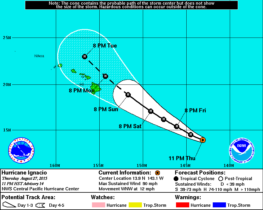 OVERALL SATELLITE PRESENTATION FOR IGNACIO HAS CHANGED LITTLE OVERNIGHT...WITH AN OBLONG 180 NM WIDE CDO HIDING THE LLCC. A VERY COLD MINUS 90 DEGREE CELSIUS CONVECTIVE TOP POPPED UP JUST SOUTH OF THE SUSPECTED CENTER WITHIN THE PAST FEW HOURS...WHILE THE FIRST GOOD HINT AT A CONSISTENT WARM SPOT IS NOTED BEGINNING WITH 1300 UTC IMAGERY. AN 1130 UTC AMSU PASS ADDS CONFIDENCE TO THE 1200 UTC POSITIONAL FIX. SUBJECTIVE DVORAK SATELLITE INTENSITY ESTIMATES RANGED ONCE AGAIN FROM 4.5...77 KT...FROM SAB TO 5.0...90 KT FROM JTWC AND PHFO. UW-CIMSS ADT SHOWS AN UNCHANGING 80 KT AND...GIVEN THE ALMOST STEADY STATE SATELLITE PRESENTATION...WE WILL MAKE 80 KT OUR INITIAL INTENSITY FOR THIS ADVISORY. IGNACIO CONTINUES TO SLIDE WEST NORTHWESTWARD ALONG THE SOUTHEAST FLANK OF A WEAKENING SUBTROPICAL RIDGE. INITIAL MOTION FOR THIS ADVISORY IS SET AT 290/09 KT...INDICATING A SLIGHT DECREASE IN FORWARD SPEED OVER THE PAST 12 HOURS. TRACK GUIDANCE REMAINS TIGHTLY PACKED...GENERALLY SHOWING A CONTINUED MOTION INITIALLY TOWARD THE WEST NORTHWEST...THEN NORTHWEST...THROUGH THE FIVE DAY FORECAST PERIOD. GFS SHIFTED SLIGHTLY TO THE LEFT AT 120 HOURS AND BEYOND...BUT WAS NEARLY UNCHANGED ELSEWHERE ALONG THE TRACK. CONSENSUS GUIDANCE IS ALSO ALMOST UNCHANGED SINCE THE LAST ECMWF RUN WAS AT 0000 UTC. IN CONTRAST...HWRF AND GFDL CONTINUE SHIFTING NOTICEABLY TO THE RIGHT...WITH HWRF NOW TURNING IGNACIO SHARPLY NORTHWARD BEYOND 72 HOURS. THE FORECAST TRACK FOR THIS ADVISORY IS UNCHANGED FROM THE PREVIOUS ONE...FOLLOWING THE CONSENSUS ARC BUT REMAINING ON THE LEFT EDGE OF THE GUIDANCE ENVELOPE. SHIPS GUIDANCE SHOWS THE WINDOW FOR SYSTEM INTENSIFICATION CLOSING AFTER 36 HOURS...WITH SLIGHTLY COOLER SSTS AND INCREASING SHEAR TAKING A STEADY TOLL ON INTENSITY AFTER 48 HOURS. THAT SAID...IGNACIO IS IN A FRIENDLY ENVIRONMENT RIGHT NOW...WITH LOW SHEAR AND SSTS ABOVE 28 DEGREES CELSIUS. FOLLOWING THE SHIPS GUIDANCE TREND...IGNACIO IS FORECAST TO SLOWLY STRENGTHEN TO 95 KT AT 36 HOURS...MAINTAIN THAT STRENGTH THROUGH 48 HOURS...THEN STEADILY WEAKEN THROUGH THE REST OF THE FORECAST PERIOD. TO STAY IN LINE WITH SHIPS...THE RATE OF WEAKENING WAS DECREASED SLIGHTLY FOR THIS ADVISORY...KEEPING IGNACIO AT 70 KT AT 120 HOURS. THIS TREND ALSO CLOSELY FOLLOWS HWRF...BUT IS WEAKER THAN GFDL. THE FORECAST HAS THE CENTER OF IGNACIO PASSING CLOSE TO...BUT JUST NORTHEAST OF...THE MAIN HAWAIIAN ISLANDS AS A HURRICANE EARLY NEXT WEEK. FORECAST POSITIONS AND MAX WINDS INIT 28/1500Z 14.1N 143.8W 80 KT 90 MPH 12H 29/0000Z 14.7N 145.1W 85 KT 100 MPH 24H 29/1200Z 15.6N 146.7W 90 KT 105 MPH 36H 30/0000Z 16.5N 148.1W 95 KT 110 MPH 48H 30/1200Z 17.3N 149.5W 90 KT 105 MPH 72H 31/1200Z 19.2N 152.2W 80 KT 90 MPH 96H 01/1200Z 21.2N 154.7W 75 KT 85 MPH 120H 02/1200Z 23.3N 157.1W 70 KT 80 MPH