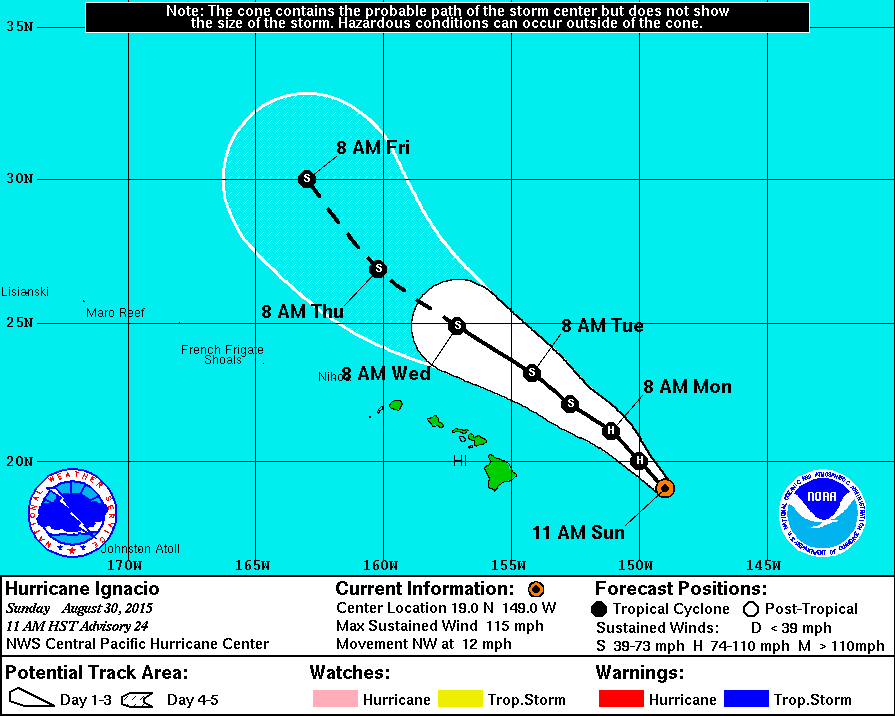 Looking more & more like Mauna Kea is doing her magic again as Ignacio is now expected to pass a bit further North & East and is weakening even faster than was thought!