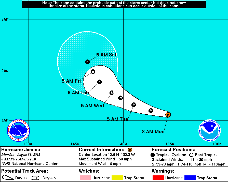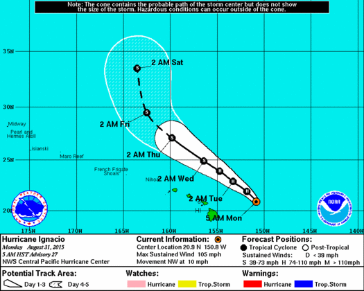 IGNACIO STEADILY WEAKENING WHILE PASSING SEVERAL HUNDRED MILES EAST OF THE BIG ISLAND AND MAUI... SUMMARY OF 500 AM HST...1500 UTC...INFORMATION ---------------------------------------------- LOCATION...20.9N 150.8W ABOUT 460 MI...735 KM E OF HONOLULU HAWAII ABOUT 335 MI...540 KM E OF HANA HAWAII MAXIMUM SUSTAINED WINDS...105 MPH...165 KM/H PRESENT MOVEMENT...NW OR 320 DEGREES AT 10 MPH...17 KM/H MINIMUM CENTRAL PRESSURE...966 MB...28.53 INCHES WATCHES AND WARNINGS -------------------- THERE ARE NO COASTAL WATCHES OR WARNINGS IN EFFECT. INTERESTS IN THE HAWAIIAN ISLANDS SHOULD CONTINUE TO CLOSELY MONITOR THE PROGRESS OF IGNACIO. DISCUSSION AND 48-HOUR OUTLOOK ------------------------------ AT 500 AM HST...1500 UTC...THE CENTER OF HURRICANE IGNACIO WAS LOCATED NEAR LATITUDE 20.9 NORTH...LONGITUDE 150.8 WEST. IGNACIO IS MOVING TOWARD THE NORTHWEST NEAR 10 MPH...17 KM/H...AND THIS MOTION IS EXPECTED TO CONTINUE FOR THE NEXT COUPLE OF DAYS. ON THE FORECAST TRACK...IGNACIO WILL PASS EAST AND NORTHEAST OF THE MAIN HAWAIIAN ISLANDS OVER THE NEXT COUPLE OF DAYS. MAXIMUM SUSTAINED WINDS ARE NEAR 105 MPH...165 KM/H...WITH HIGHER GUSTS. SIGNIFICANT WEAKENING IS EXPECTED THE NEXT COUPLE OF DAYS... ALTHOUGH THE RATE OF WEAKENING IS EXPECTED TO SLOW ON TUESDAY AND WEDNESDAY. HURRICANE FORCE WINDS EXTEND OUTWARD UP TO 60 MILES...95 KM...FROM THE CENTER...AND TROPICAL STORM FORCE WINDS EXTEND OUTWARD UP TO 175 MILES