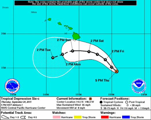 TROPICAL DEPRESSION SIX-C DISCUSSION NUMBER 1 NWS CENTRAL PACIFIC HURRICANE CENTER HONOLULU HI CP062015 500 PM HST THU SEP 24 2015RECENT SATELLITE IMAGES SHOWED THAT A TROPICAL DISTURBANCE SOUTHEAST OF THE MAIN HAWAIIAN ISLANDS HAS DEVELOPED DEEP CONVECTION WITHIN A CURVED BAND NEAR ITS CENTER. IN ADDITION...A 1953 UTC ASCAT PASS SHOWED WINDS AT 30 KT WITHIN 80 NM OF THE DISTURBANCE/S EASTERN SEMICIRCLE. SUBJECTIVE DVORAK FIXES UNANIMOUSLY CAME IN AT 2.0/30 KT. AS A RESULT OF THESE DATA...ADVISORIES ARE BEING INITIATED ON TROPICAL DEPRESSION SIX-C. THIS IS THE ELEVENTH TROPICAL CYCLONE IN THE CENTRAL NORTH PACIFIC BASIN FOR THE 2015 SEASON AND TIES THE RECORD FOR THE MOST ACTIVE SEASON WHICH WAS SET IN 1992 AND REPEATED IN 1994. THE DEPRESSION IS MOVING AT 320/7 KT TOWARDS A WEAKNESS IN THE SUBTROPICAL RIDGE. THIS MOTION IS EXPECTED TO CONTINUE OVER THE NEXT COUPLE OF DAYS. A LARGE MIDDLE AND UPPER LEVEL LOW PRESSURE SYSTEM CURRENTLY FAR NORTHEAST OF THE HAWAIIAN ISLANDS IS FORECAST TO MOVE TOWARD THE SOUTHEAST. AN ASSOCIATED TROUGH EXTENDING SOUTHWEST FROM THE LOW WILL SHIFT SOUTHWARD...RESULTING IN AN INCREASE IN UPPER LEVEL SOUTHWESTERLIES...AND VERTICAL WIND SHEAR...THAT WILL IMPACT THE TROPICAL CYCLONE. GLOBAL MODELS SHOW THAT THE VERTICAL SHEAR WILL DECOUPLE THE SYSTEM BEYOND 48 HOURS...WHICH MEANS THE CYCLONE WILL BECOME SHALLOW AND MOVE WITH THE LOWER LEVEL STEERING CURRENT. THE RELIABLE DYNAMICAL MODELS ARE IN GENERAL AGREEMENT WITH THIS SCENARIO AND ARE FAIRLY CLOSE TO EACH OTHER WITH THE MAIN DIFFERENCES BEING THE FORWARD SPEED AFTER DECOUPLING OCCURS. THE TRACK FORECAST FOR THIS ADVISORY CLOSELY FOLLOWS THE DYNAMIC CONSENSUS AND IS BETWEEN THE GFS TO THE SOUTH AND THE ECMWF TO THE NORTH. TROPICAL DEPRESSION SIX-C IS PASSING OVER WARM WATER...28C TO 29C BASED ON THE LATEST ANALYSIS. MODERATE SHEAR IS ALREADY AFFECTING THE SYSTEM ACCORDING TO THE 0000 UTC CIMSS ANALYSIS AND IS FORECAST TO INCREASE...ESPECIALLY BEYOND 48 HOURS. BEFORE THE STRONGER SHEAR SETS IN AND DECOUPLES THE CYCLONE...THERE APPEARS TO BE A WINDOW OF OPPORTUNITY FOR STRENGTHENING. THUS...THE FORECAST CALLS FOR SIX-C TO BECOME A TROPICAL STORM TONIGHT FOLLOWED BY STEADY WEAKENING AFTER 36 HOURS. IF IT DOES BECOME A TROPICAL STORM IT WILL BE NAMED NIALA...PRONOUNCED NEE-AH-LA. FORECAST POSITIONS AND MAX WINDS INIT 25/0300Z 14.5N 149.3W 30 KT 35 MPH 12H 25/1200Z 15.1N 150.0W 35 KT 40 MPH 24H 26/0000Z 16.2N 151.0W 40 KT 45 MPH 36H 26/1200Z 17.0N 152.2W 40 KT 45 MPH 48H 27/0000Z 17.4N 153.5W 35 KT 40 MPH 72H 28/0000Z 17.5N 156.0W 30 KT 35 MPH 96H 29/0000Z 17.0N 157.5W 30 KT 35 MPH 120H 30/0000Z 16.5N 159.0W 25 KT 30 MPH