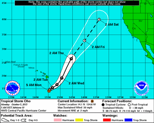 500 AM HST MON OCT 05 2015 ...TROPICAL STORM OHO MOVING SLOWLY TOWARD THE NORTH-NORTHEAST SOUTH OF THE BIG ISLAND... SUMMARY OF 500 AM HST...1500 UTC...INFORMATION ---------------------------------------------- LOCATION...14.1N 154.6W ABOUT 390 MI...625 KM S OF HILO HAWAII ABOUT 540 MI...875 KM SSE OF HONOLULU HAWAII MAXIMUM SUSTAINED WINDS...50 MPH...85 KM/H PRESENT MOVEMENT...NNE OR 20 DEGREES AT 2 MPH...4 KM/H MINIMUM CENTRAL PRESSURE...989 MB...29.21 INCHES WATCHES AND WARNINGS -------------------- THERE ARE NO COASTAL WATCHES OR WARNINGS IN EFFECT. ALL INTERESTS IN THE MAIN HAWAIIAN ISLANDS SHOULD CONTINUE TO MONITOR THE PROGRESS OF OHO DURING THE NEXT COUPLE OF DAYS. DISCUSSION AND 48-HOUR OUTLOOK ------------------------------ AT 500 AM HST...1500 UTC...THE CENTER OF TROPICAL STORM OHO WAS LOCATED NEAR LATITUDE 14.1 NORTH...LONGITUDE 154.6 WEST. OHO IS MOVING SLOWLY TOWARD THE NORTH-NORTHEAST NEAR 2 MPH...4 KM/H... BUT IT IS EXPECTED TO TURN TOWARD THE NORTHEAST LATER TODAY AND TONIGHT. OHO IS FORECAST TO MOVE AT A FASTER FORWARD SPEED TOWARD THE NORTHEAST FROM TUESDAY THROUGH TUESDAY NIGHT. MAXIMUM SUSTAINED WINDS ARE NEAR 50 MPH...85 KM/H...WITH HIGHER GUSTS. GRADUAL INTENSIFICATION IS EXPECTED THROUGH TUESDAY NIGHT. TROPICAL STORM FORCE WINDS EXTEND OUTWARD UP TO 115 MILES...185 KM FROM THE CENTER.